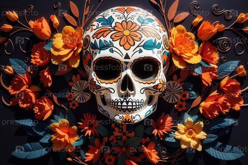 Генеративный череп с традиционным макияжем для Дня мертвых в красочных цветах Dia de los Muertos