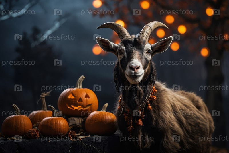 Рогатая фермерская коза на темном страшном фоне Хэллоуина с искусственным интеллектом генеративные тыквы