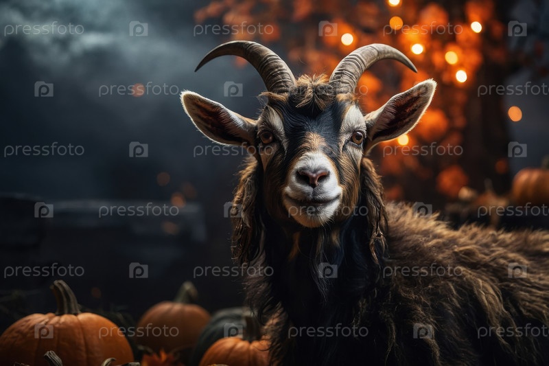 Рогатая фермерская коза на темном страшном фоне Хэллоуина с искусственным интеллектом генеративные тыквы