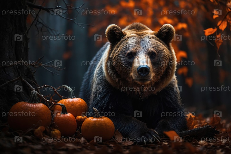 Коричневый медведь хищник животное темное пугающее Хэллоуин фоном тыква AI генеративный