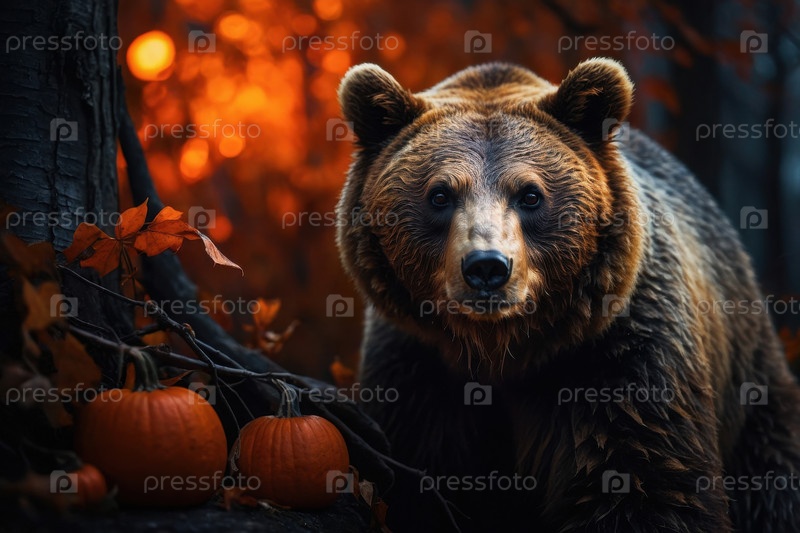 Коричневый медведь хищник животное темное пугающее Хэллоуин фоном тыква AI генеративный