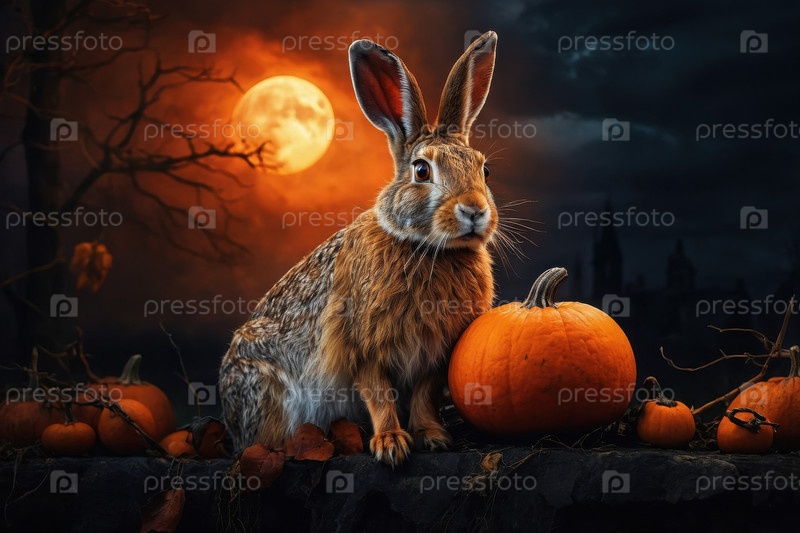 Милый пушистый кролик на темной страшной луне Хэллоуин от тыквы AI Generative