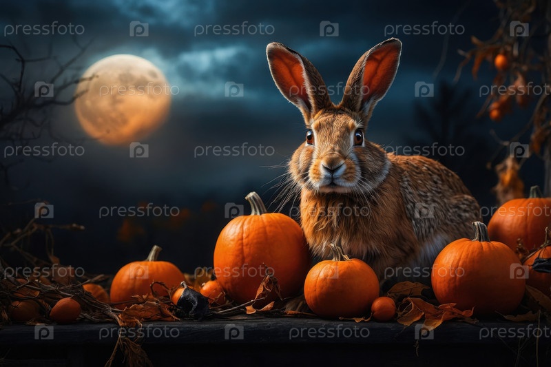 Генеративный милый пушистый кролик на темном страшном Хэллоуинском лунном свете с тыквами