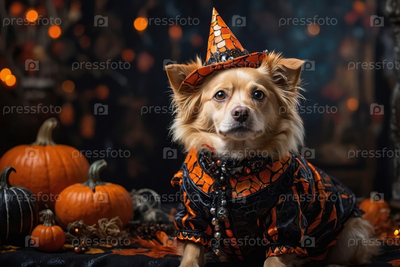 AI Generative Cute Fluffy Dog одет как ведьма на темном, пугающем тыквенном фоне