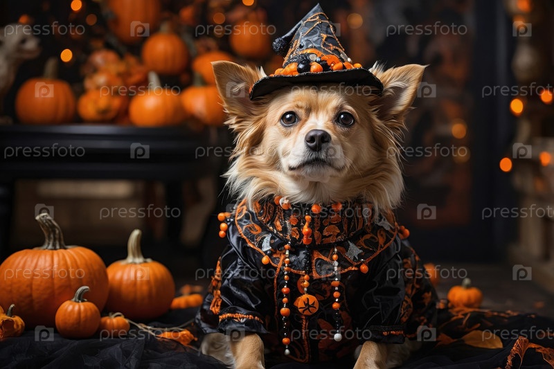 AI Generative Cute Fluffy Dog одет как ведьма на темном, пугающем тыквенном фоне