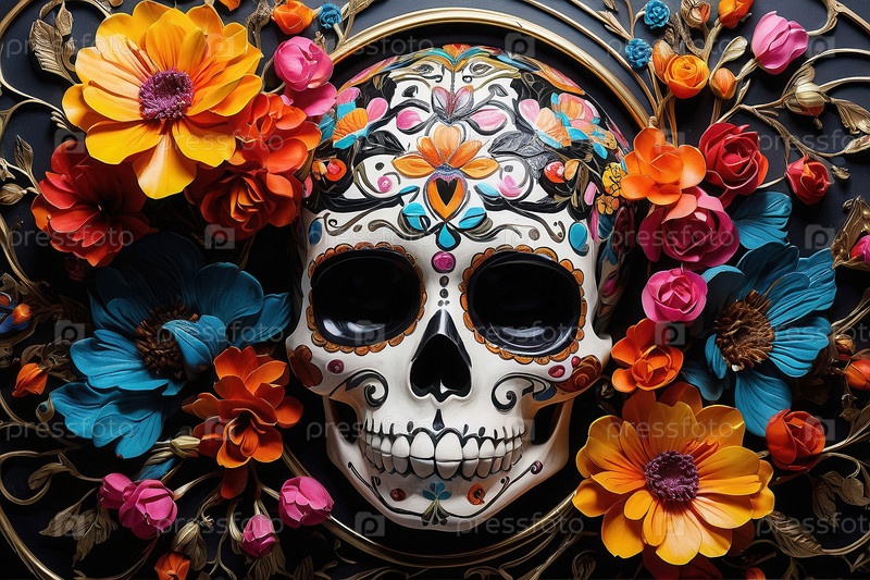 Генеративный череп с традиционным макияжем для Дня мертвых в красочных цветах Dia de los Muertos