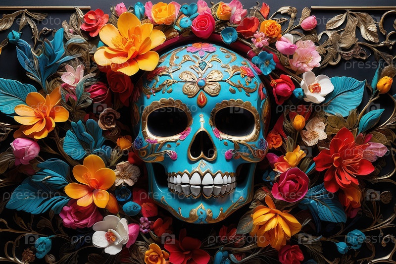 Генеративный череп с традиционным макияжем для Дня мертвых в красочных цветах Dia de los Muertos
