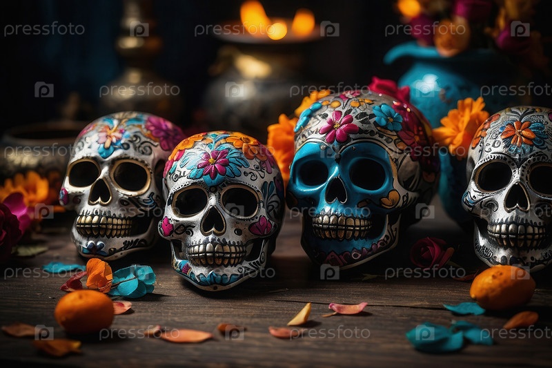 Генеративный череп с традиционным макияжем для Дня мертвых в красочных цветах Dia de los Muertos