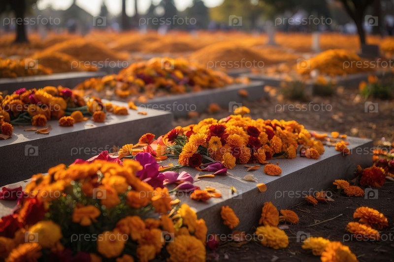 Оранжевые цветы Дня мертвых на кладбище в день его смерти