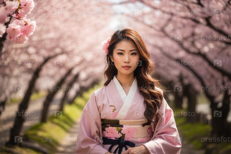 Молодая женщина в традиционном японском кимоно с вишневым цветом, открытка Дня культуры Японии