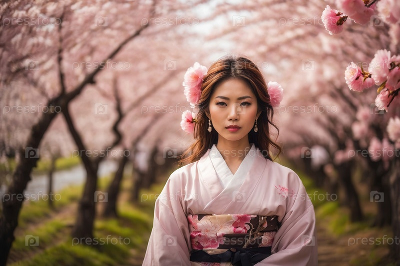 Молодая женщина в традиционном японском кимоно с вишневым цветом, открытка Дня культуры Японии