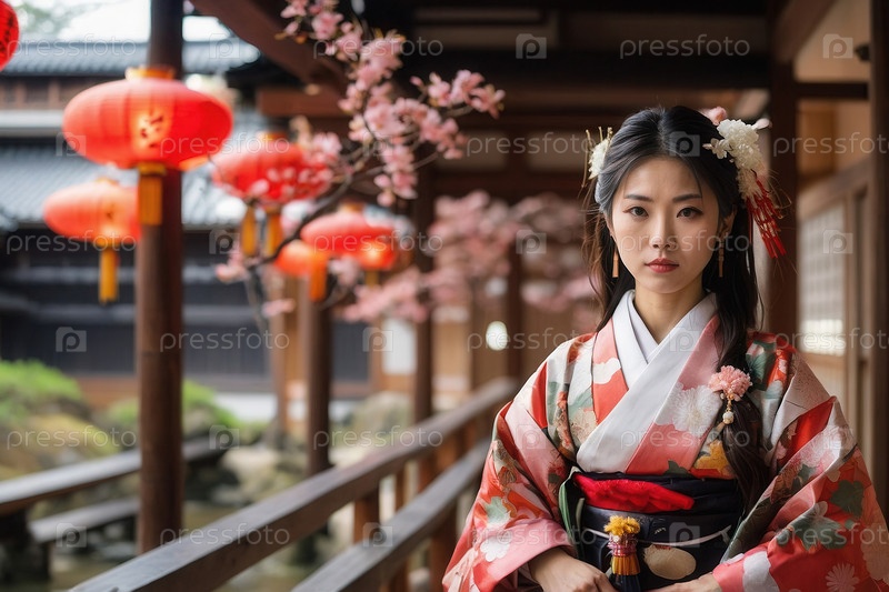 Генеративная женщина в традиционном японском кимоно на фоне архитектуры, открытка ко Дню японской культуры