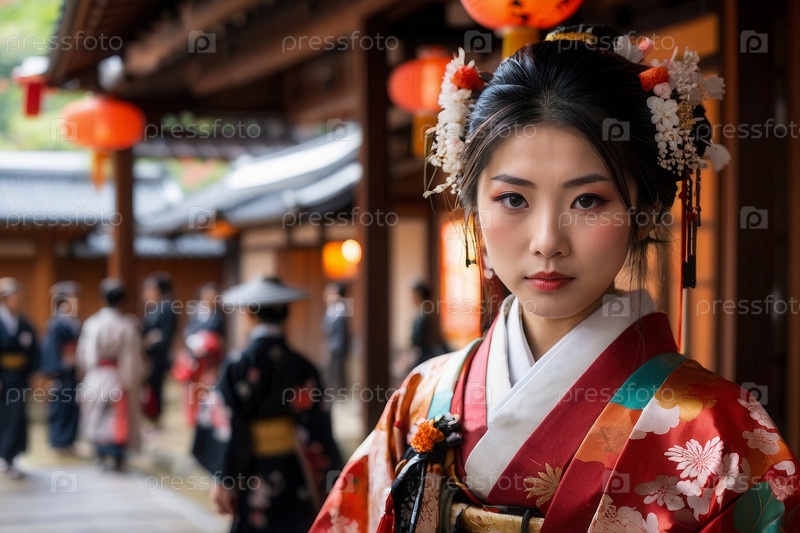 Генеративная женщина в традиционном японском кимоно на фоне архитектуры, открытка ко Дню японской культуры