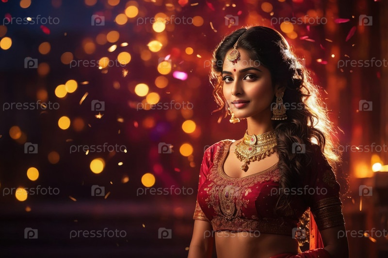 Молодая индийская женщина с портретом в традиционной одежде на фоне фестиваля Дивали