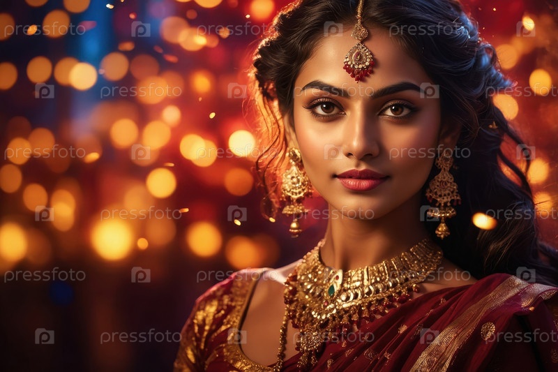 Молодая индийская женщина с портретом в традиционной одежде на фоне фестиваля Дивали