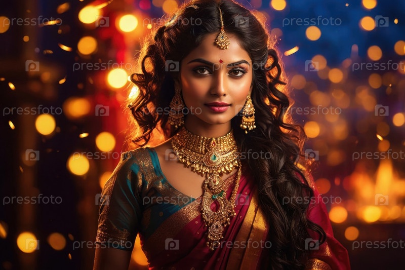 Молодая индийская женщина с портретом в традиционной одежде на фоне фестиваля Дивали