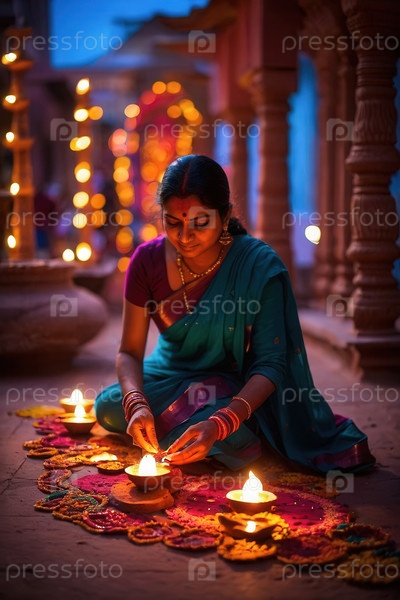 Молодая индийская женщина с портретом в традиционной одежде на фоне фестиваля Дивали