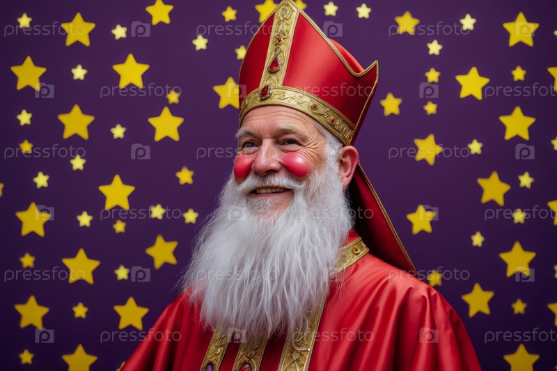 Генеративный Святой Николай Чудотворец пожилой человек в красном костюме на фиолетовом фоне со звездами