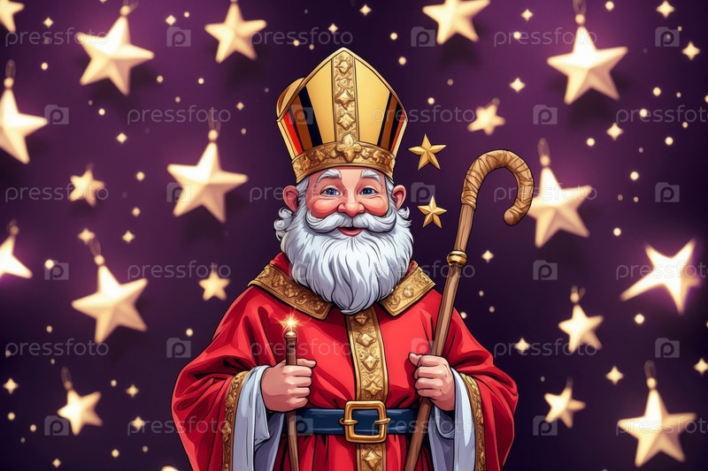 Генеративный Святой Николай Чудотворец пожилой человек в красном костюме на фиолетовом фоне со звездами