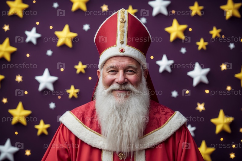 Генеративный Святой Николай Чудотворец пожилой человек в красном костюме на фиолетовом фоне со звездами