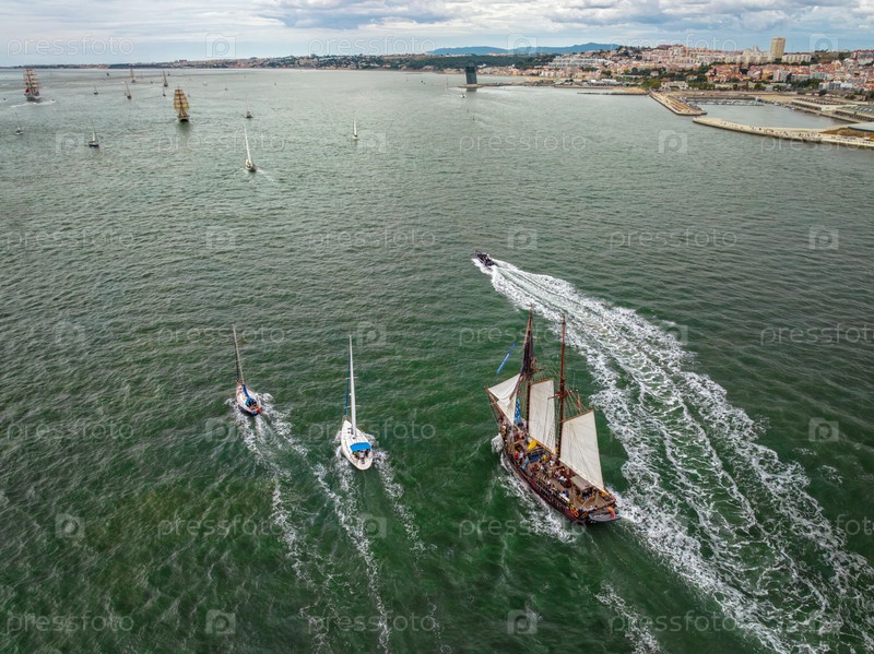 Вид высоких судов с парусами, плавающих в реке Таго к Атлантическому океану в Лиссабоне, Португалия