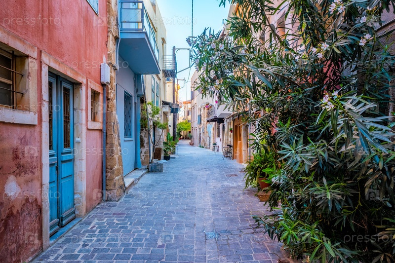 Живописные улицы Ханьи Венецианский город с уютными старыми домами.Утром в деревне Ханья греческий Чанака, остров Крит, Греция