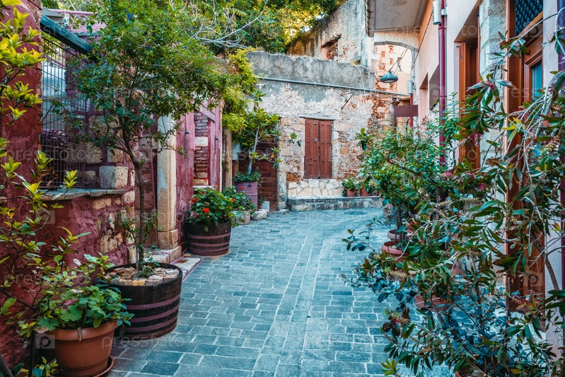 Живописные улицы Ханьи Венецианский город с уютными старыми домами.Утром в деревне Ханья греческий Чанака, остров Крит, Греция
