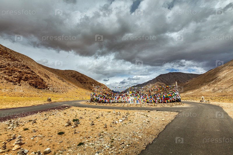 Дорожные и буддийские молитвенные флаги в Ладакхе