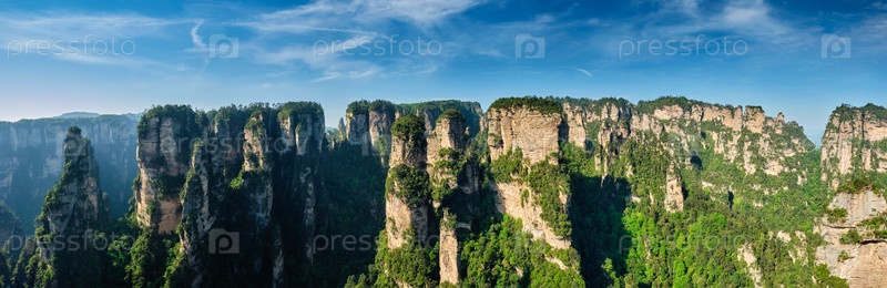 Панорама знаменитой туристической достопримечательности Китая Аватарные горы - каменные столбы скальных гор Чжанцзянджи при закате солнца в Улингюане, провинция Хунань, Китай
