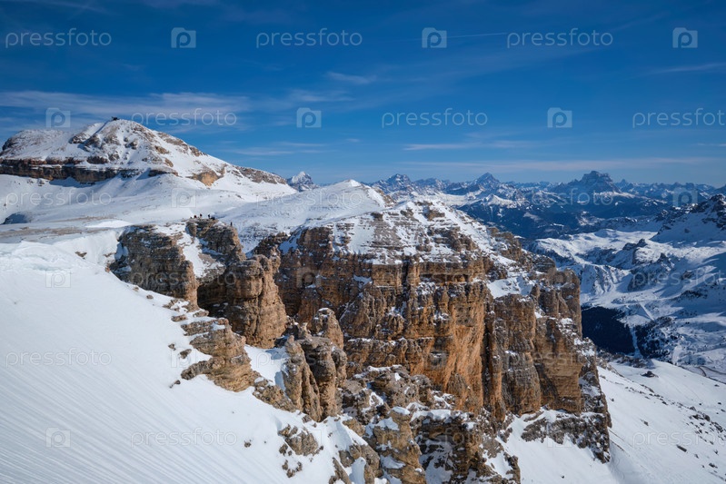 Вид на горнолыжный курорт Piste и Доломиты в Италии с перевала Пасо Пордой
