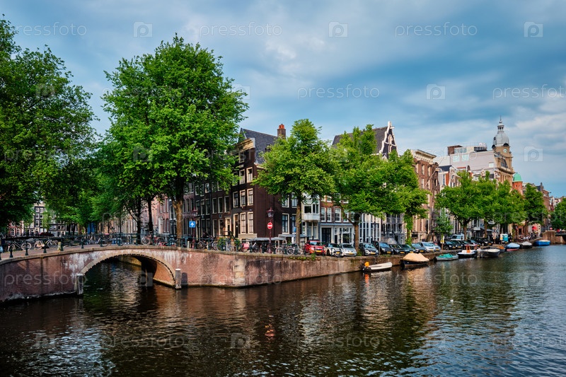 Вид на Амстердам - канал с бодом, мостом и старыми домами