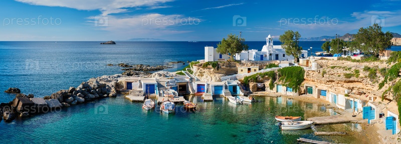 Панорамой типичной Греции является живописный вид на остров - небольшая гавань с рыбацкими лодками в кристально чистой бирюзовой воде, традиционные белые церковные дома