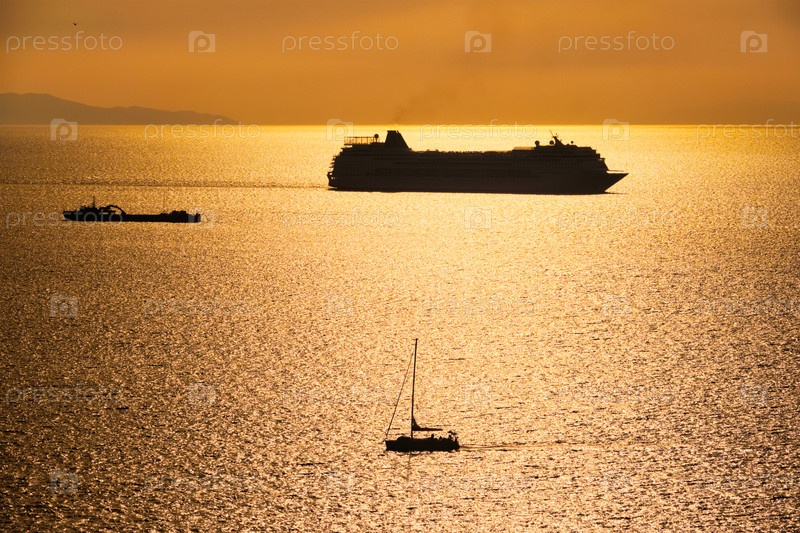 Силуэт круизного лайнера в Эгейском море на закате
