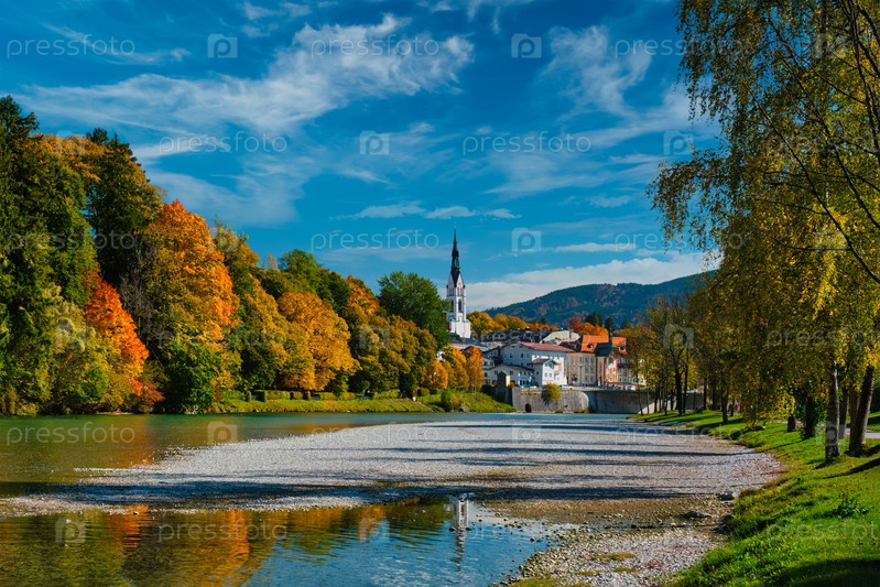 Вид на Бад-Толц - живописный курортный город в Баварии, Германия осенью и реку Исар
