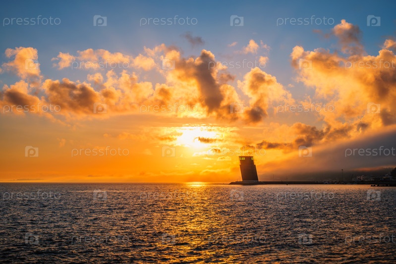 Torre VTS de Lisboa - Центр ВТС по координации и контролю морского транспорта и безопасности силуэта Лиссабона с заходящим небом на берегу реки Таго, Португалия при закате