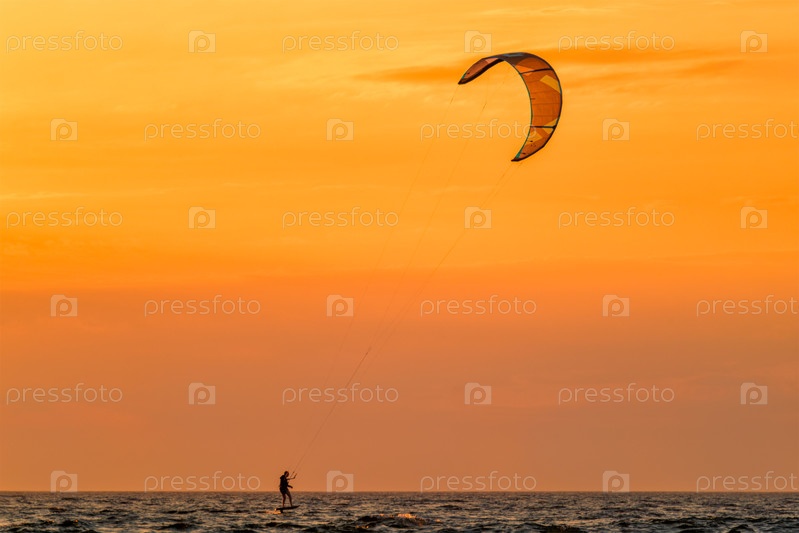 Китсерфер - это силуэт в Атлантическом океане на закате.Фонте да Телла Бич, Коста-да-Капарика, Португалия