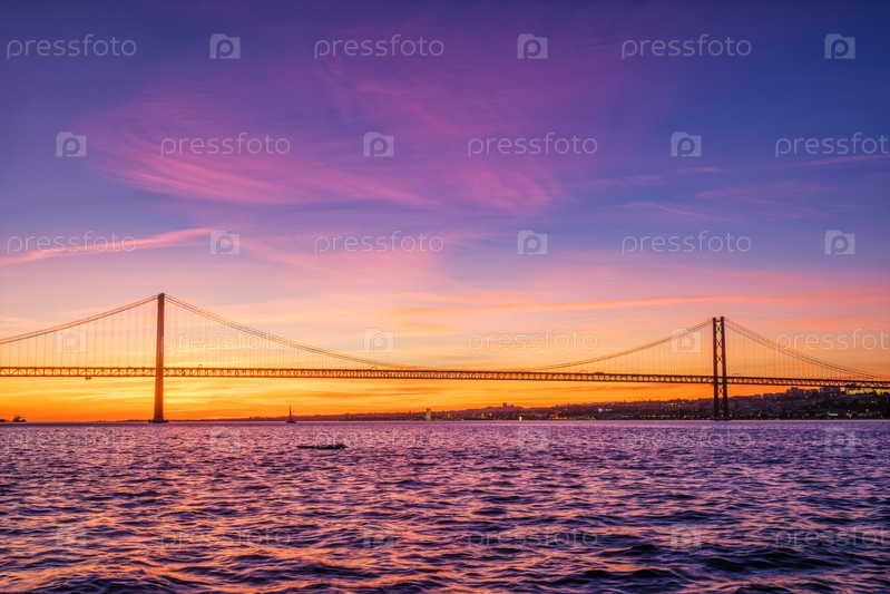 Вид на мост 25 апреля над рекой Таго при закате солнца.Лиссабон, Португалия