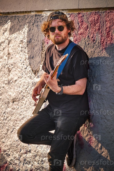 Хипстерский уличный музыкант в черном играет на электрической гитаре снаружи при закате, опираясь на стену