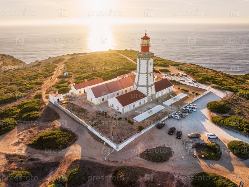 Вид с беспилотника на маяк у мыса Эспихель в Атлантическом океане при закате.Чесимбра, Португалия
