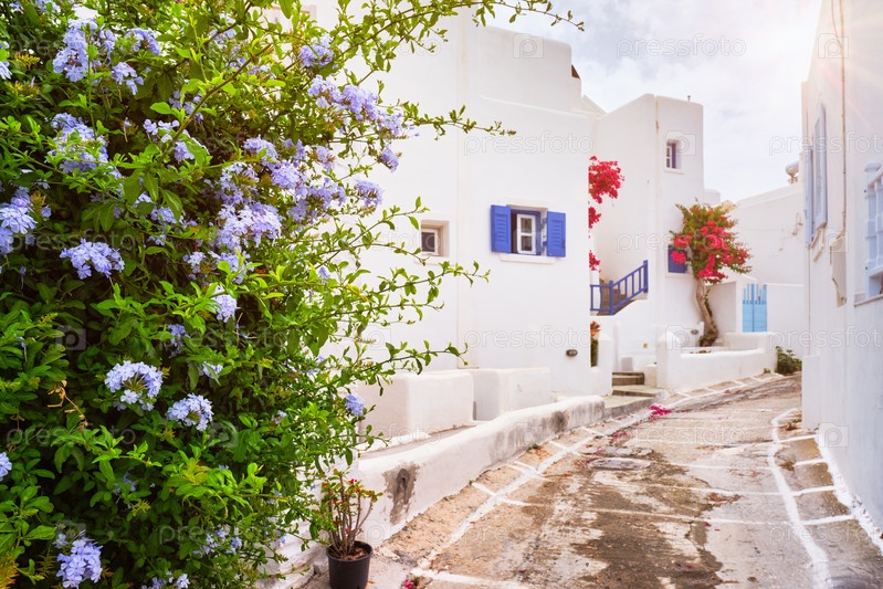 Живописная узкая улица с традиционными белыми домами с цветущими бугенвильскими цветами города Науза в знаменитой туристической достопримечательности острова Парос, Греция
