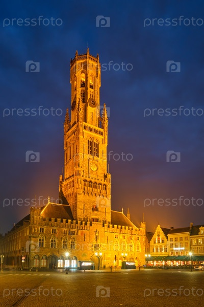 Башня Белфрея знаменитое туристическое направление и площадь Grote Markt в Брюгге, Бельгия на закате