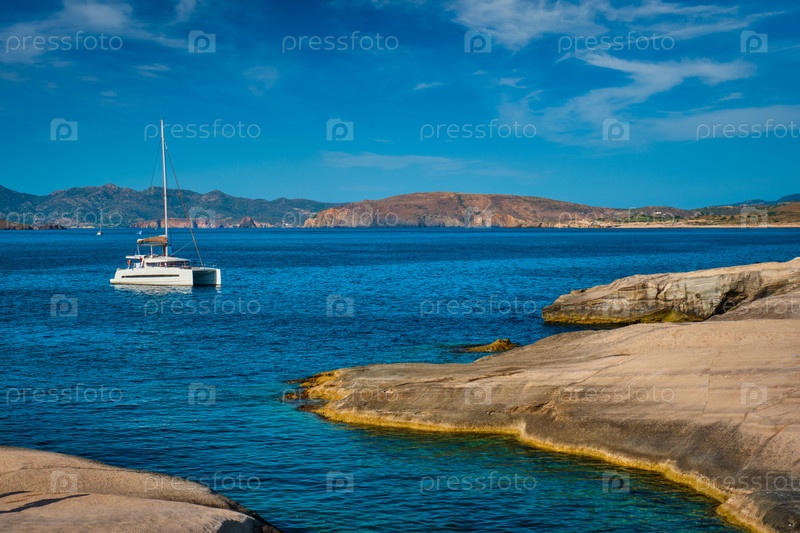 Яхта на пляже Саранико в Эгейском море, остров Милос, Греция