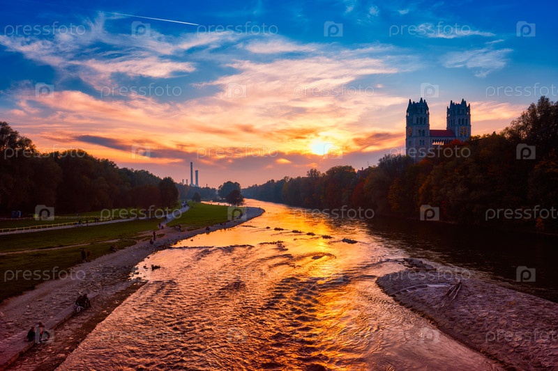 Река Исар, парк и шерковский Максимилианы с мостом Рейхенбах.Мюнхен, Бавария, Германия