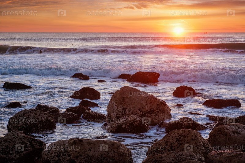 Закат Атлантический океан с вулнами и скаллами из Коста-да-Капарики, Португалия