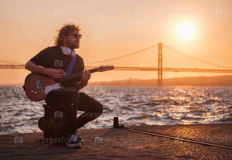 Хипстерский уличный музыкант в черном играет на электрической гитаре снаружи при закате