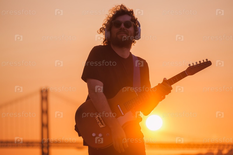 Уличный музыкант играет на электрической гитаре на улице
