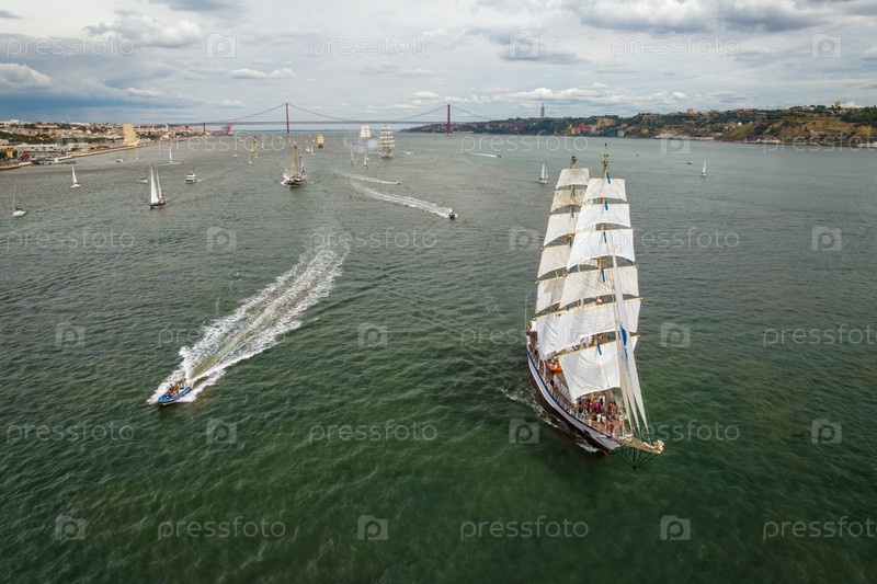 Вид высоких судов с парусами, плавающих в реке Таго к Атлантическому океану в Лиссабоне, Португалия