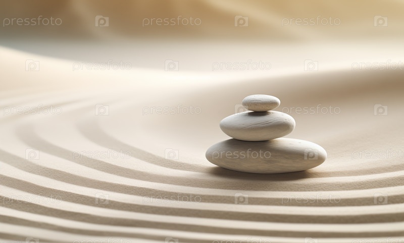 Дзен-камни складываются в песок в минималистской обстановке для баланса и гармонии