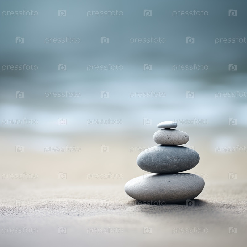 Дзен-камни складываются на песчаных волнах в минималистской обстановке для достижения равновесия и гармонии