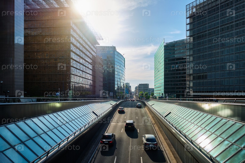 Уличный трафик в Брюсселе за пределами здания Европейской комиссии на закате